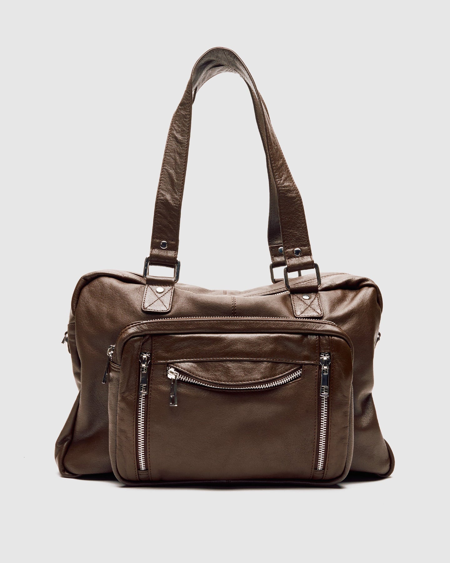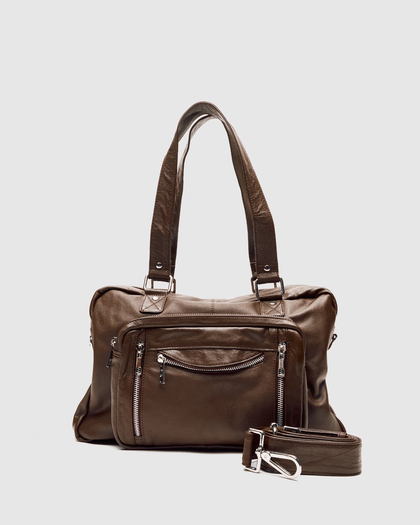 Mille i mørk brun har et stort rum, der lukkes med en lynlås, og har en lille lomme foran. Tasken leveres med en justerbar rem og har to kortere skulderremme.